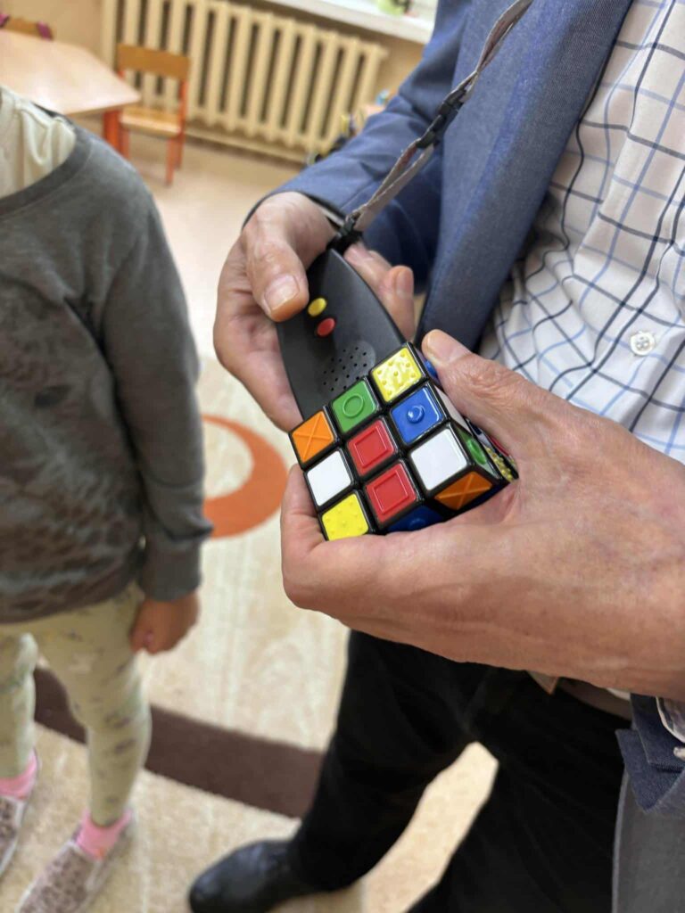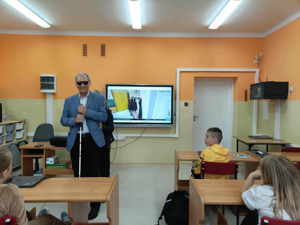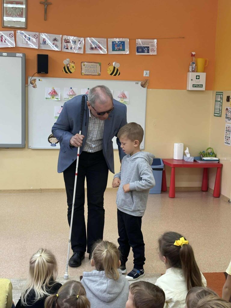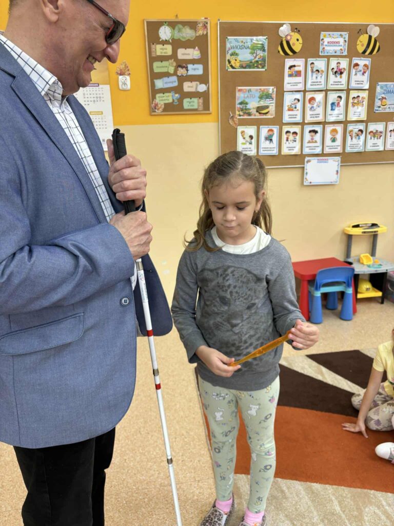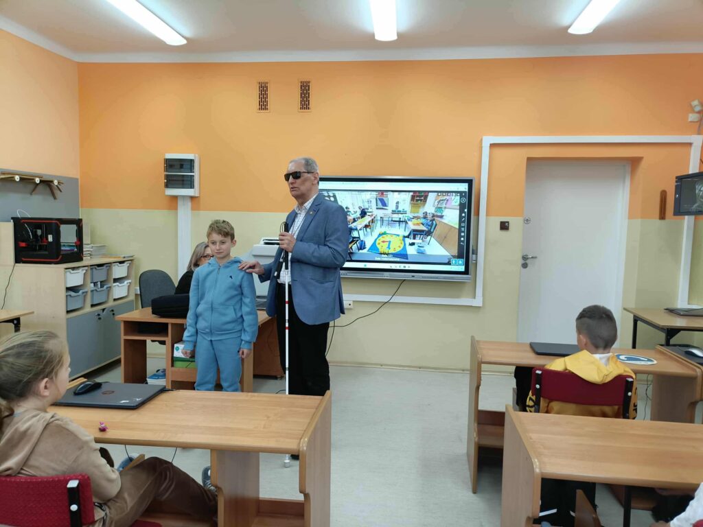 Pan Krzysztof opowiedział o swoim codziennym życiu, o urządzeniach ułatwiających funkcjonowanie osobom z dysfunkcją wzroku, a także przeprowadził wesołą zabawę z dziećmi