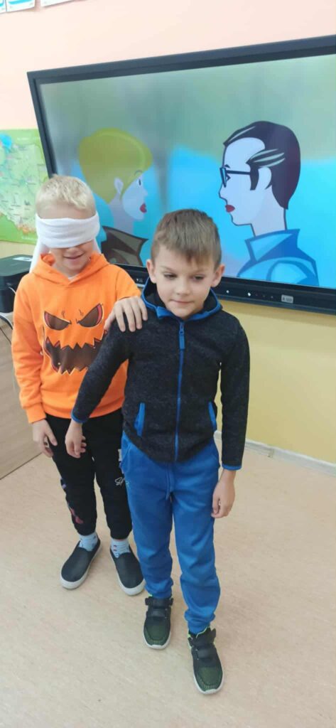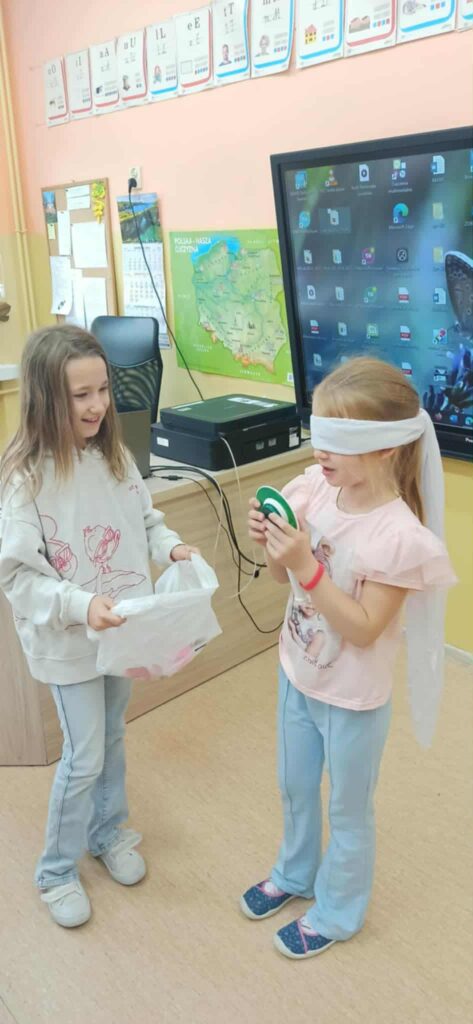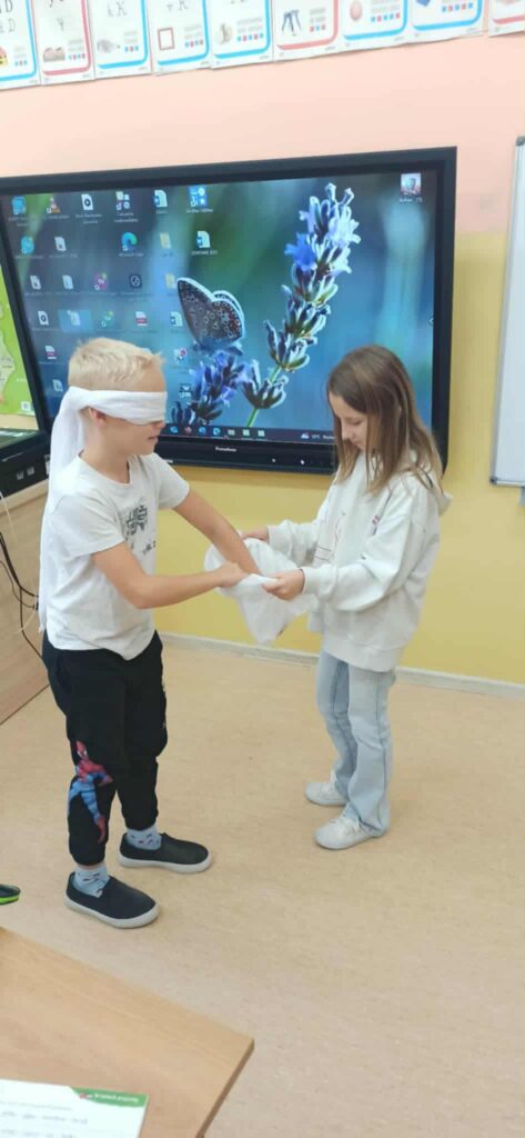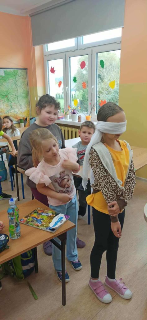 Dzieci z grup przedszkolnych oraz uczniowie klas I–III uczestniczyli w różnorodnych zabawach sensorycznych i ruchowych, takich jak: „Rozpoznaj po dotyku”, „Wróć na swoje miejsce”, „Słuchaj i znajdź”, „Co to za przedmiot?” oraz „Prowadź mnie”.