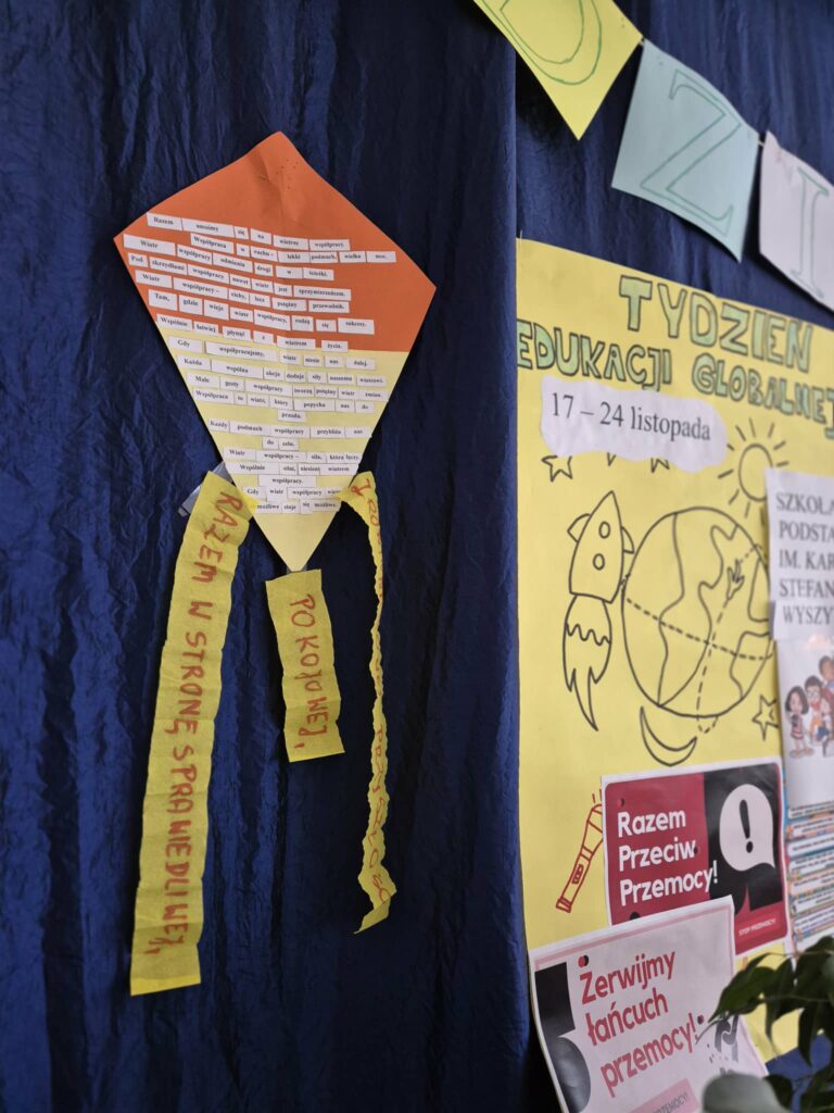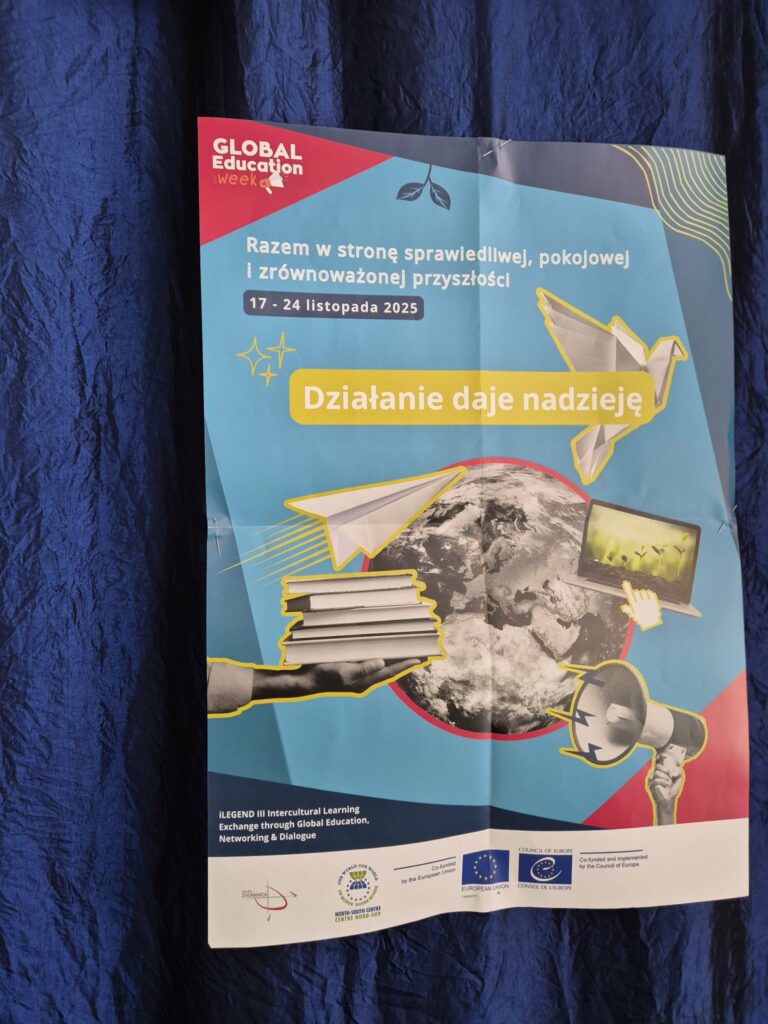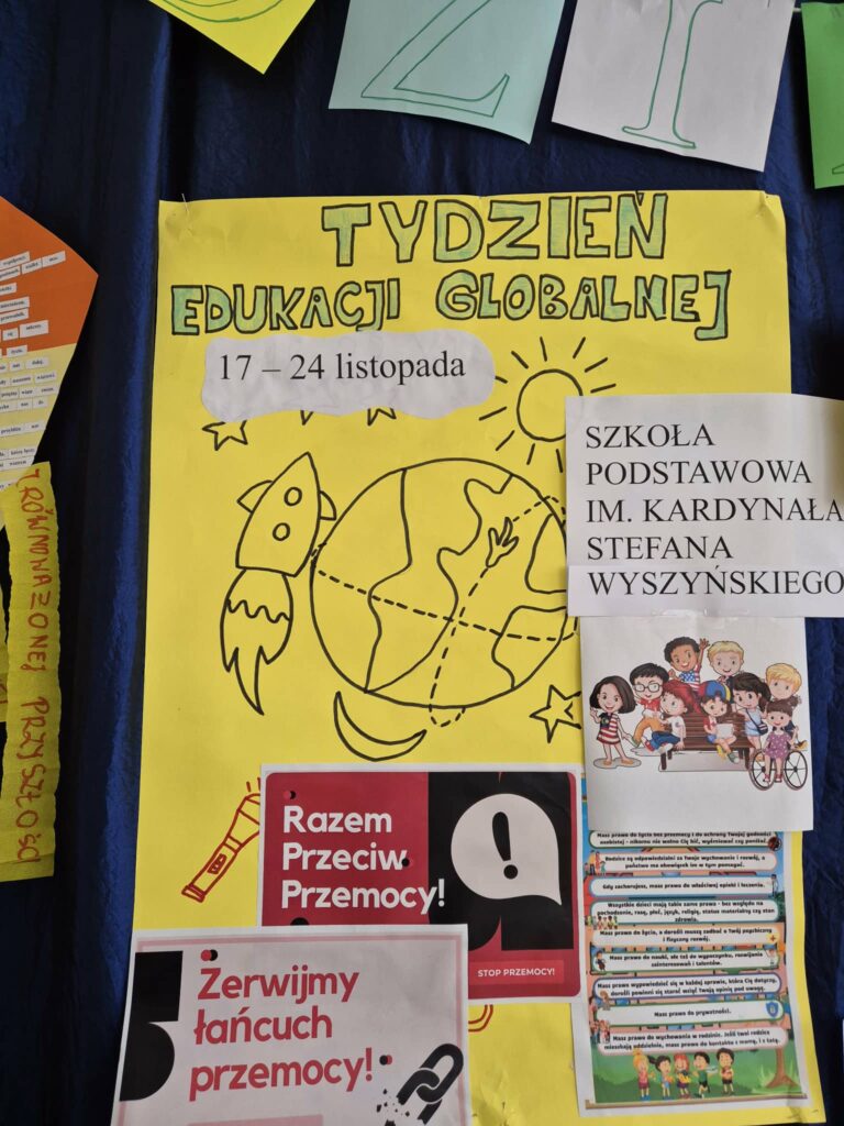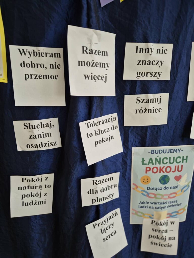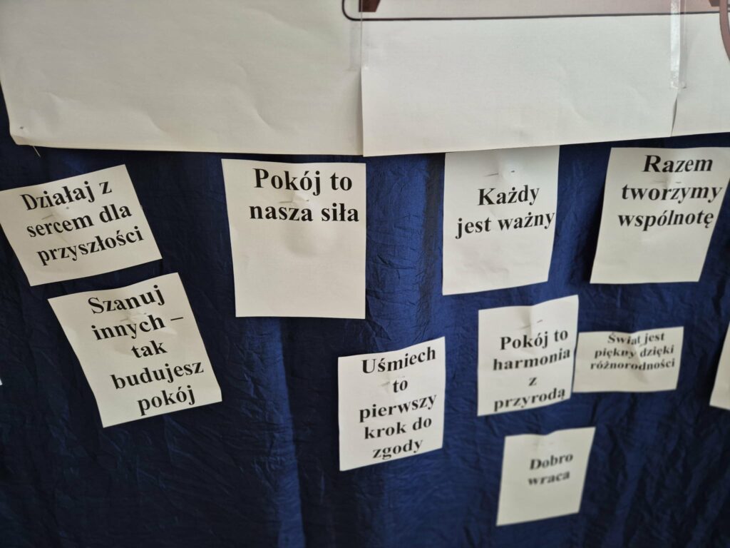 Tydzień Edukacji Globalnej pod hasłem „Działanie daje nadzieję”. Był to czas pełen inspirujących rozmów, twórczych działań i wspólnej refleksji nad tym, jak możemy budować bardziej sprawiedliwy, pokojowy i zrównoważony świat. Korytarze wypełniły hasła przypominające o szacunku, współpracy i jedności — takie jak: „Chrońmy Ziemię – nasz wspólny dom”, „Pokój z naturą to pokój z ludźmi”, „Razem dla dobra planety”, „Działaj z sercem dla przyszłości”, „Pokój to harmonia z przyrodą”, „Kolor skóry, język, kraj – wszyscy mamy to samo serce”, „Tolerancja to klucz do pokoju”, „Pokój zaczyna się od nas”, „Szanuj innych – tak budujesz pokój”.